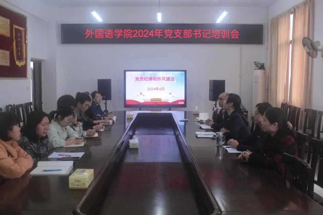 为深入学习贯彻党的二十大精神,深刻领悟“两个确立”的决定性意义、坚决做到“两个维护”,进一步严明党的各项纪律和规矩,不断加强作风建设,增强自我净化、自我完善、自我革新、自我提高能力,4月16日下午,我院二级理论学习中心组(扩大)在外语楼南213会议开展“党员纪律和作风建设”专题学习暨党支部书记专题培训活动。本次专题学习培训由我院党总支书记贺琴琴主讲,全体党总支委员和党支部书记参加学习。