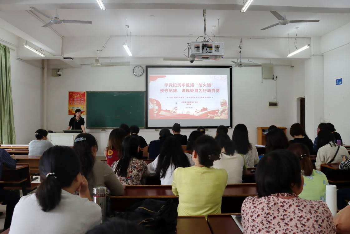 党纪学习教育,是加强党的纪律建设、推动全面从严治党向纵深发展的重要举措。为深入学习贯彻、深刻领悟“两个确立”的决定性意义,坚决做到“两个维护”,切实在思想和行动上与党中央决策部署统一,5月22日下午,学院在外语楼北208教室开展“学党纪筑牢规矩‘防火墙’,使守纪律、讲规矩成为行动自觉”党纪学习教育培训,学院全体党员参加,学院党总支书记贺琴琴作专题辅导。