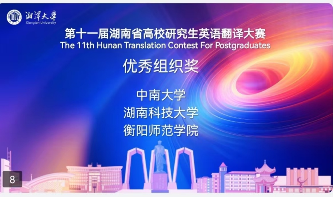 2024年11月9日,由湖南省教育厅主办、湘潭大学承办的第十一届湖南省高校研究生英语翻译大赛落下帷幕。我院学子在这场竞争激烈的赛事中捷报频传,斩获多项佳绩,展现了我院学子风采。