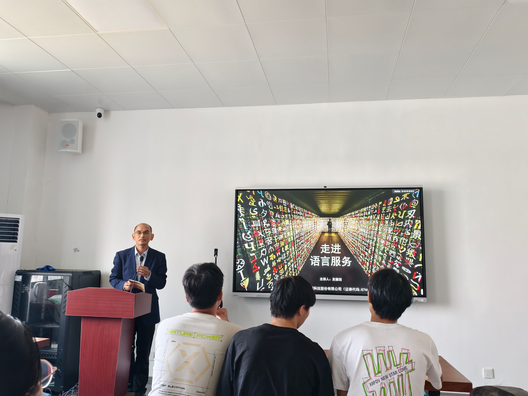 2025年10月15日下午14时30分,深圳火星语盟科技股份有限公司经理史振羽先生和华中区校企负责人袁俊涛经理莅临我院。史振羽先生为师生带来了一场题为"走进语言服务"的专题讲座。本次讲座由刘剑院长主持、何文娟副院长出席,吸引了包括研究生、本科生在内的60余名师生共同参与。