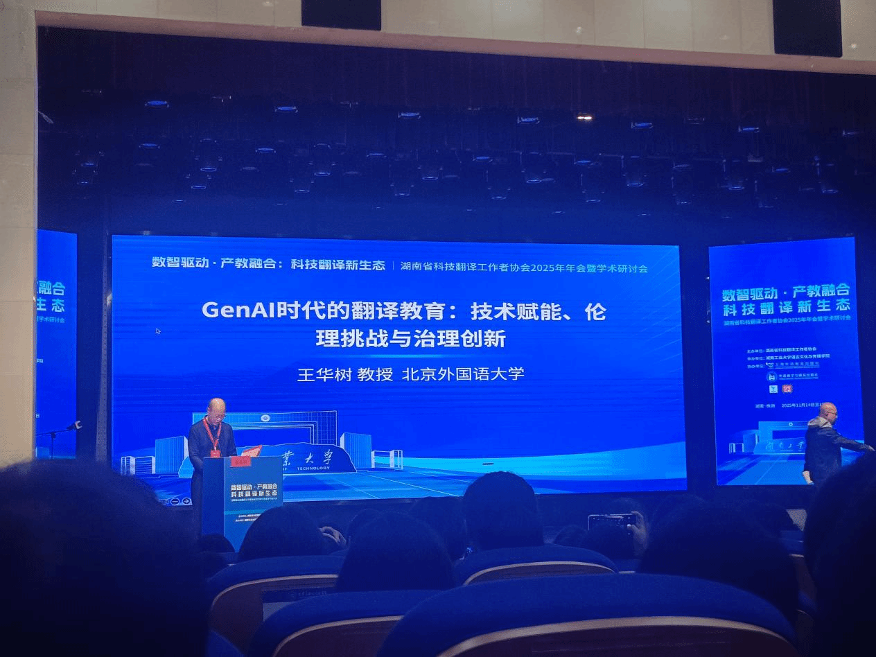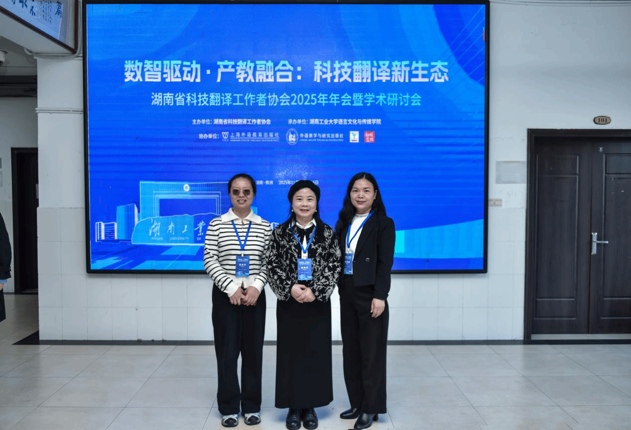 为深入贯彻国家数字化转型与产教融合战略部署,响应《“十四五”数字经济发展规划》中“推动数字技术与实体经济深度融合”的号召,同时呼应我院“课堂教学革命活动月”“促进人工智能与专业教学深度融合”的主题,聚焦科技翻译与语言服务创新核心议题,英国365集团副院长何文娟及张敏、刘聪两位老师,于20251114日至15日赴株洲,参加湖南省科技翻译工作者协会2025年年会暨“数智驱动·产教融合:科技翻译新生态”学术研讨会。本次会议由湖南省科技翻译工作者协会主办,湖南工业大学语言文化与传媒学院承办,上海外语教育出版社、外语教学与研究出版社等单位协办。